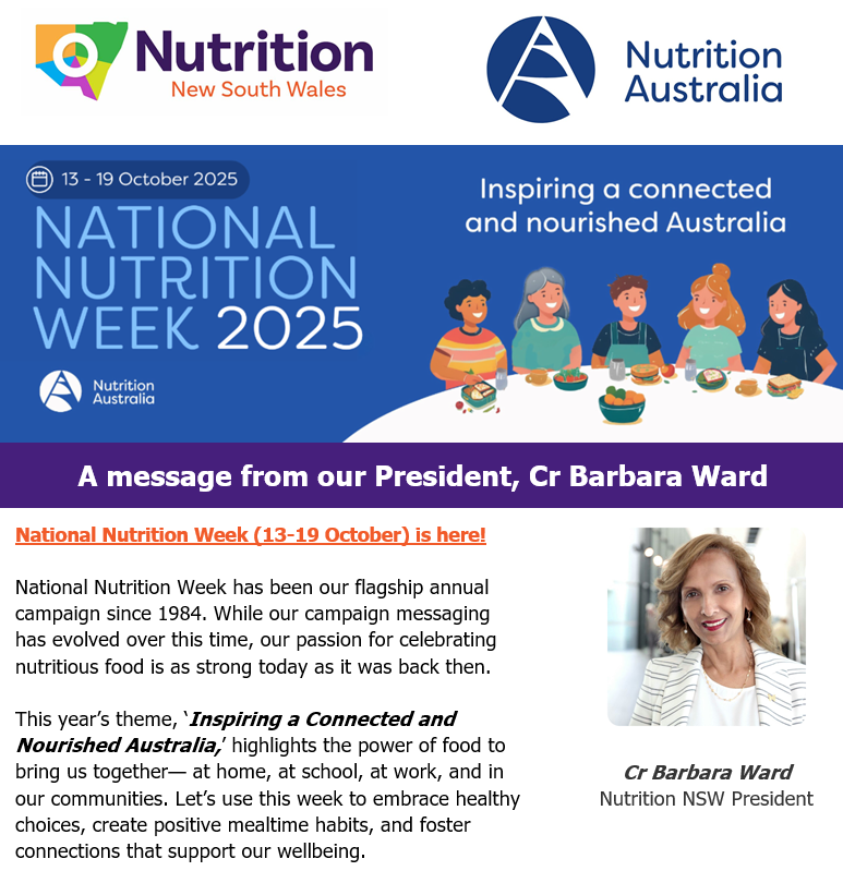 “I am proud to celebrate over 40 years of Nutrition Australia’s commitment to nourishing our nation. This year’s theme, ‘Inspiring a Connected and Nourished Australia,’ highlights the power of food to bring us together— at home, at school, at work, and in our communities. Let’s use this week to embrace healthy choices, create positive mealtime habits, and foster connections that support our wellbeing.’ Cr Barbara Ward, Nutrition Australia (NSW) President.