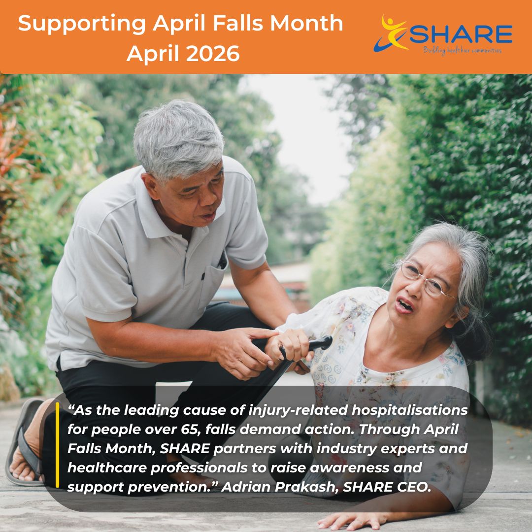 “April Falls Month 2026 SHARE raises awareness about the significant impact of falls not only on individuals but also on families, and the health sector. Falls is a leading cause of injury, hospitalisation, and loss of independence, particularly amid older adults, many are preventable through SHARE’s evidence-based programs with education and offerings of regular physical activity such as strength and balance” Adrian Prakash.